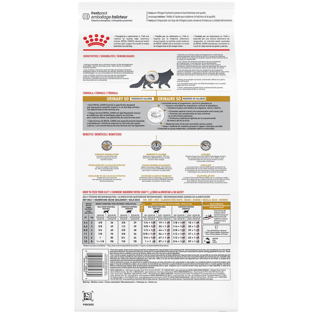 ¿Tu gato sufre de problemas urinarios o tiene tendencia al sobrepeso? Este alimento especializado está formulado para ayudar a disolver cálculos de estruvita y mantener la salud urinaria, controlando al mismo tiempo las calorías para gatos menos activos o esterilizados.